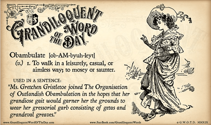 Obambulate (v): to walk in a leisurely, casual, or aimless way; to mosey or saunter; to meander